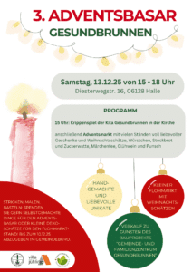 Einander neu kennenlernen oder wieder begegnen nach der Krabbelgruppenzeit. Ein sommerlicher Nachmittag mit Picknick, Singen und Spielen… 15.00 – 17.30 Uhr auf der Wiese vor der Kirche in Landsberg gemeinsam mit dem Kirchgemeindeverband Landsberg. Eine Anmeldung…